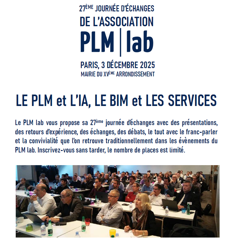 Le 3 décembre 2025 à la mairie du XVème arrondissement de Paris, l'association PLM Lab a organisé sa 27ème journée d'échanges, autour des liens entre le PLM et l'IA, le BIM, les services.